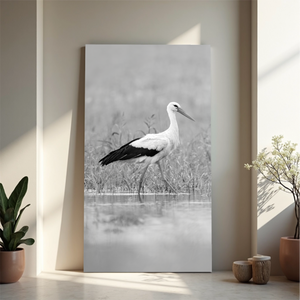 Pridih elegance in naravne harmonije z umetniškim tiskom na platno »Črno-bela štorklja v naravi«. Minimalistična črno-bela fotografija ujame graciozno podobo štorklje med sprehodom po vodi. Ta motiv se odlično poda v sodobne in klasične interierje, saj združuje čistočo linij in miren naravni prizor.