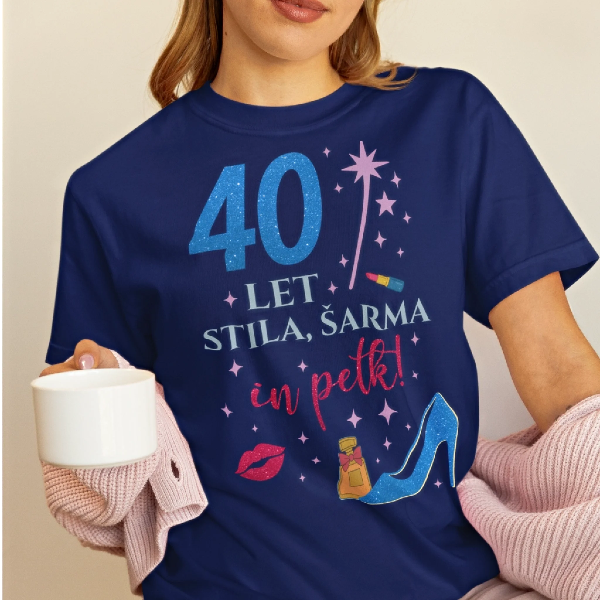 Sproščena, samozavestna in polna šarma! Ta majica “40 let stila, šarma in petk” je popolno darilo za žensko, ki ve, kdo je in kaj želi. Igriv dizajn z bleščečimi poudarki v modri in rožnati barvi simbolizira eleganco, energijo in pridih glamurja.