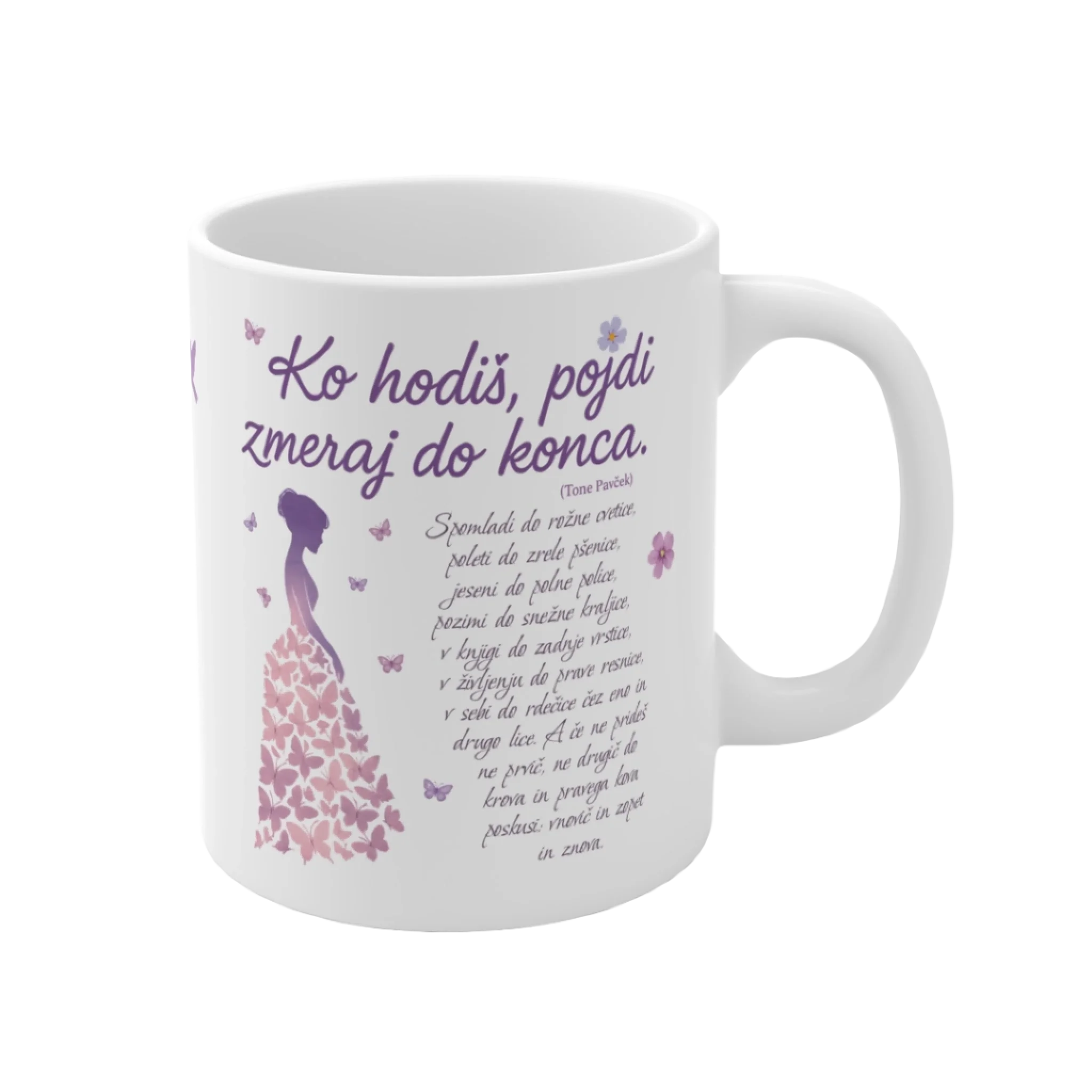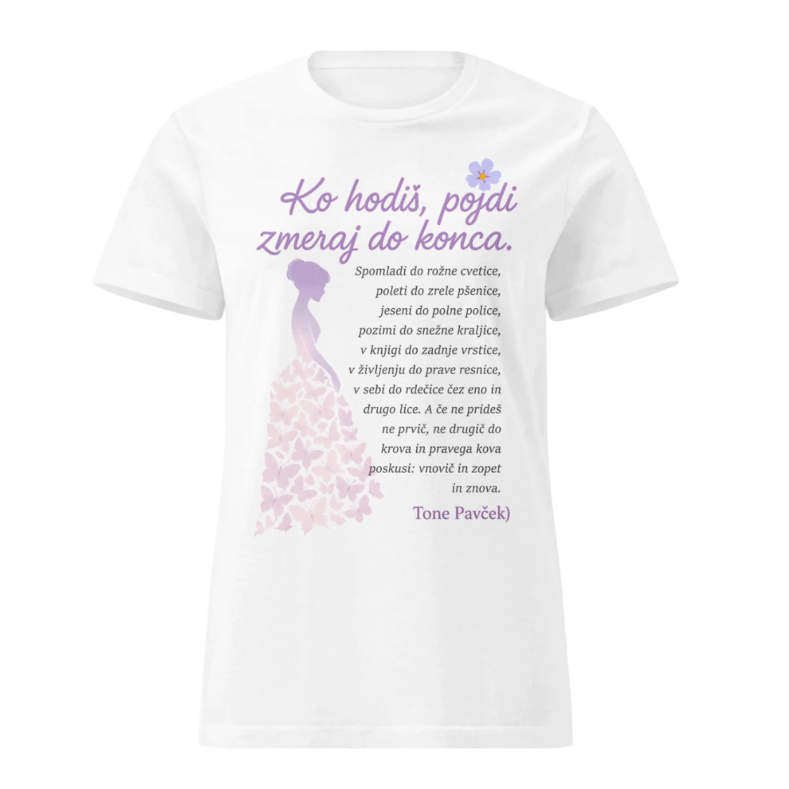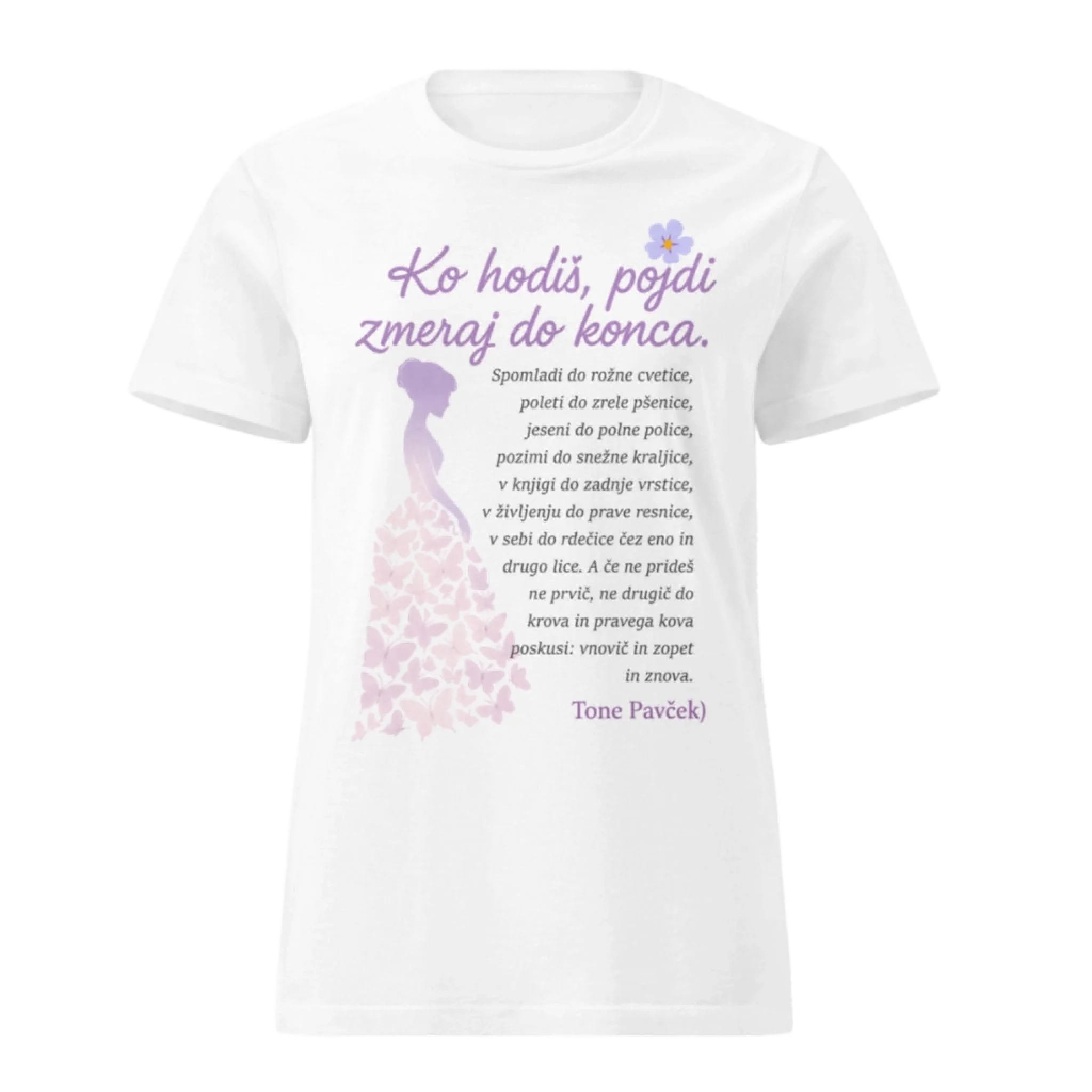 Verz Toneta Pavčka, ki nas spominja, da je v življenju pomembno vztrajati – skozi letne čase, preizkušnje in trenutke rasti. Ta poetična majica nosi simbol metuljev in žensko silhueto, ki nežno uteleša gibanje, preobrazbo in notranjo moč.